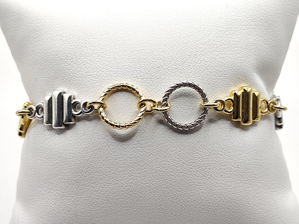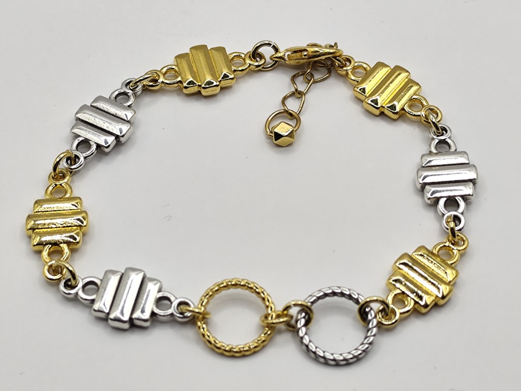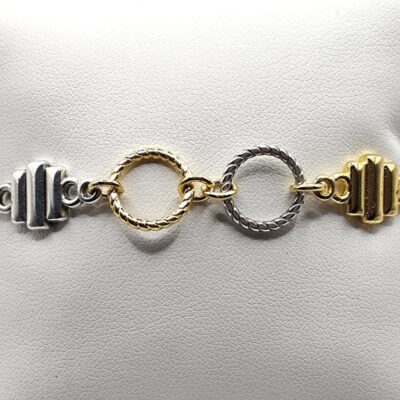 Χειροποίητο βραχιόλι που χαρίζει λάμψη σε κάθε εμφάνιση. Δίχρωμο φτιαγμένο από μεταλλικά μοτίφ και κρίκους στο κέντρο από ανοξείδωτο ατσάλι απλά ή επιχρυσωμένα 18 – 24κ.