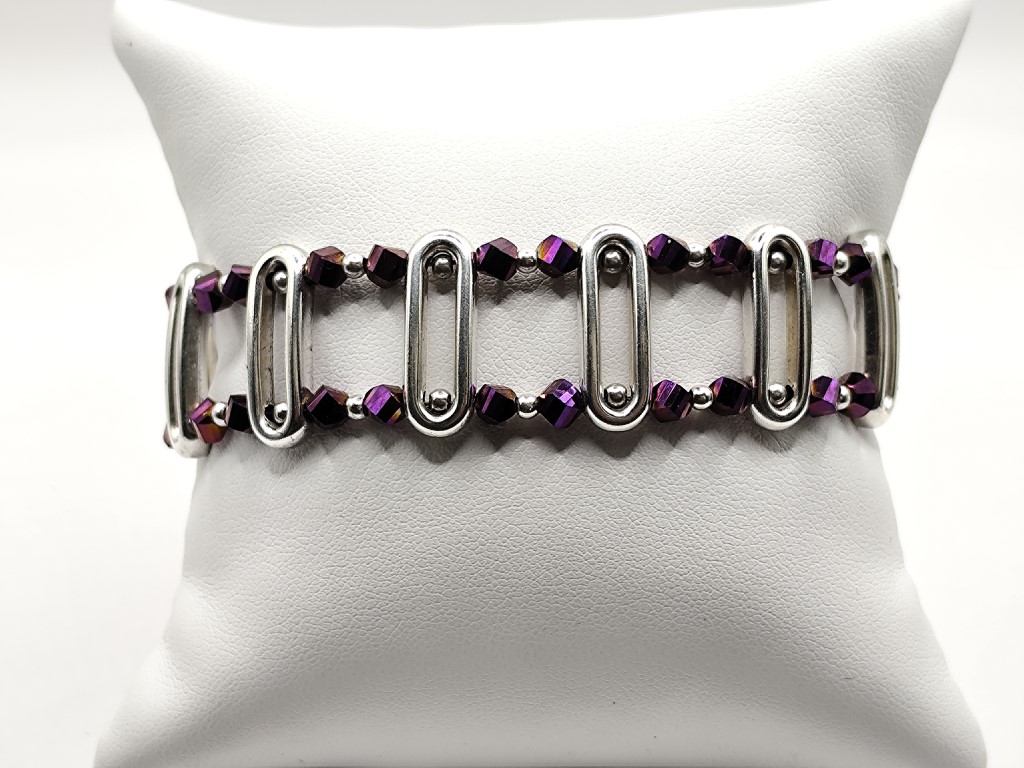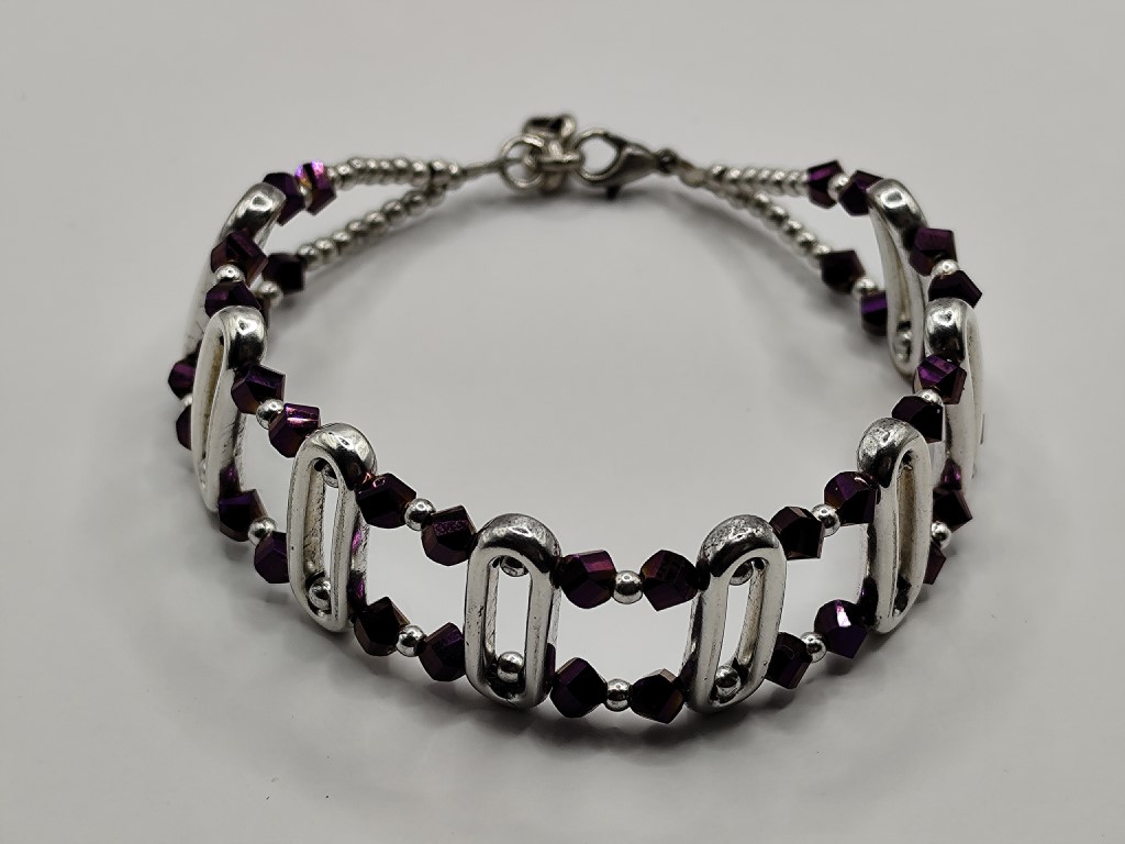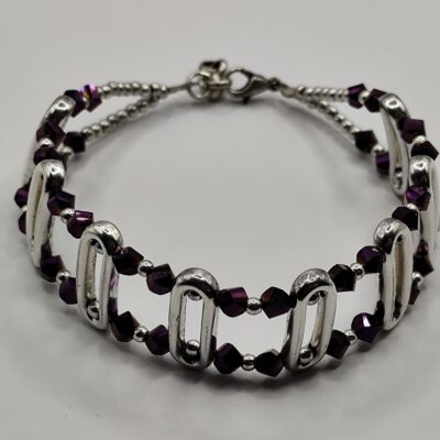 Χειροποίητο βραχιόλι εντυπωσιακό φτιαγμένο από μεταλλικά κομμάτια από ανοξείδωτο ατσάλι για αντοχή και λάμψη,συμπληρώνοντας την πολυτελή του όψη μωβ κρύσταλλοι.