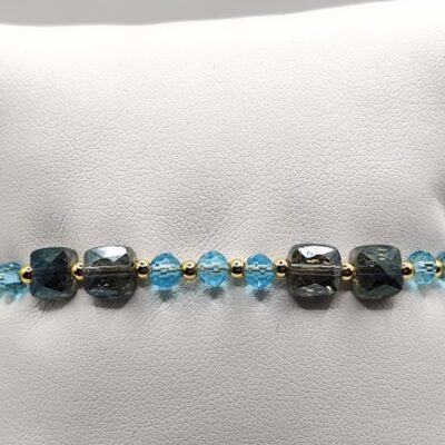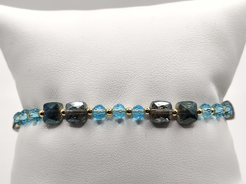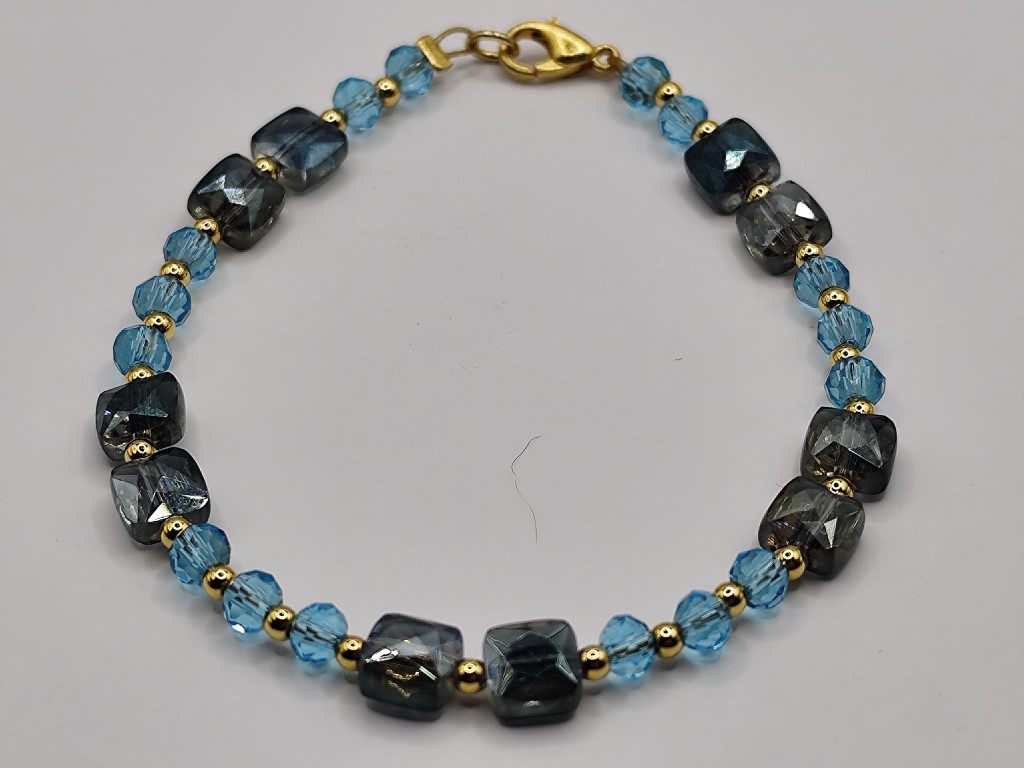 Χειροποίητο βραχιόλι με τετράγωνους ιριδίζων κρύσταλλους που παίζουν οι αποχρώσεις τους με το φως και γαλάζιους .