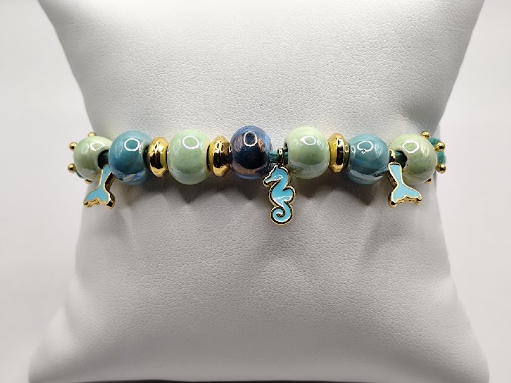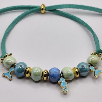 Χειροποίητο βραχιόλι φτιαγμένο με κεραμικές χάντρες με επισμάλτωση και διαφορα επιχρυσωμένα στοιχεία 18 – 24κ με σμάλτο περασμένα σε σουιτ τιρκουάζ κορδόνι