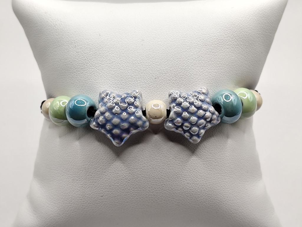 Χειροποίητο βραχιόλι διχρωμο με κεραμικές χάντρες κεντρικο στοιχείο κεραμικοί αστερίες όλα επισμαλτωμένα και περασμένα σε μαύρο κορδόνι.
