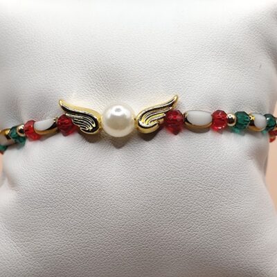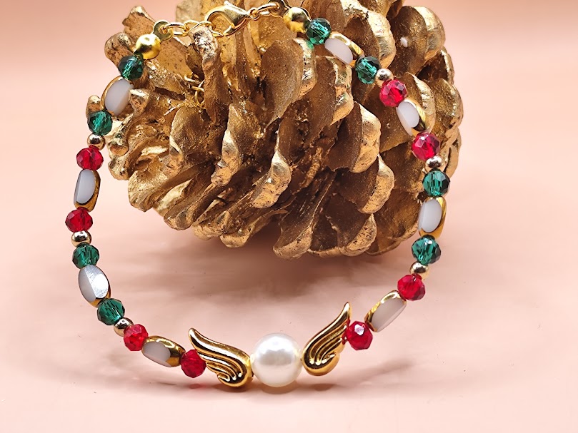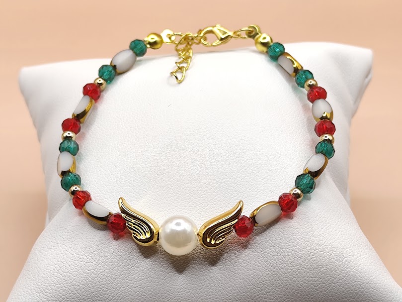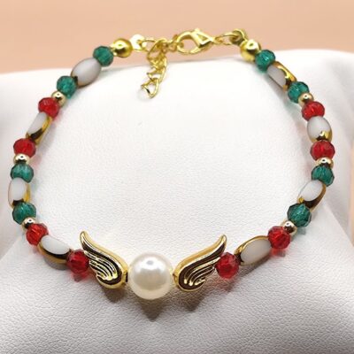 Χειροποίητο βραχιόλι – γούρι φτιαγμένο με χρωματιστούς κρύσταλλους ,πέρλα και επιχρυσωμένα φτερά 18-24κ.