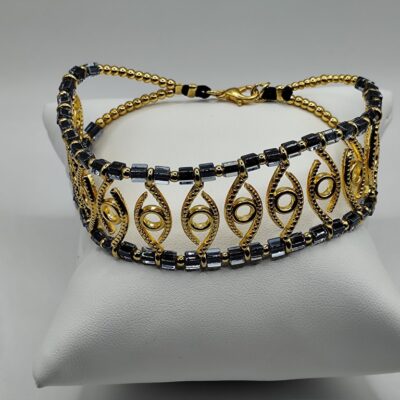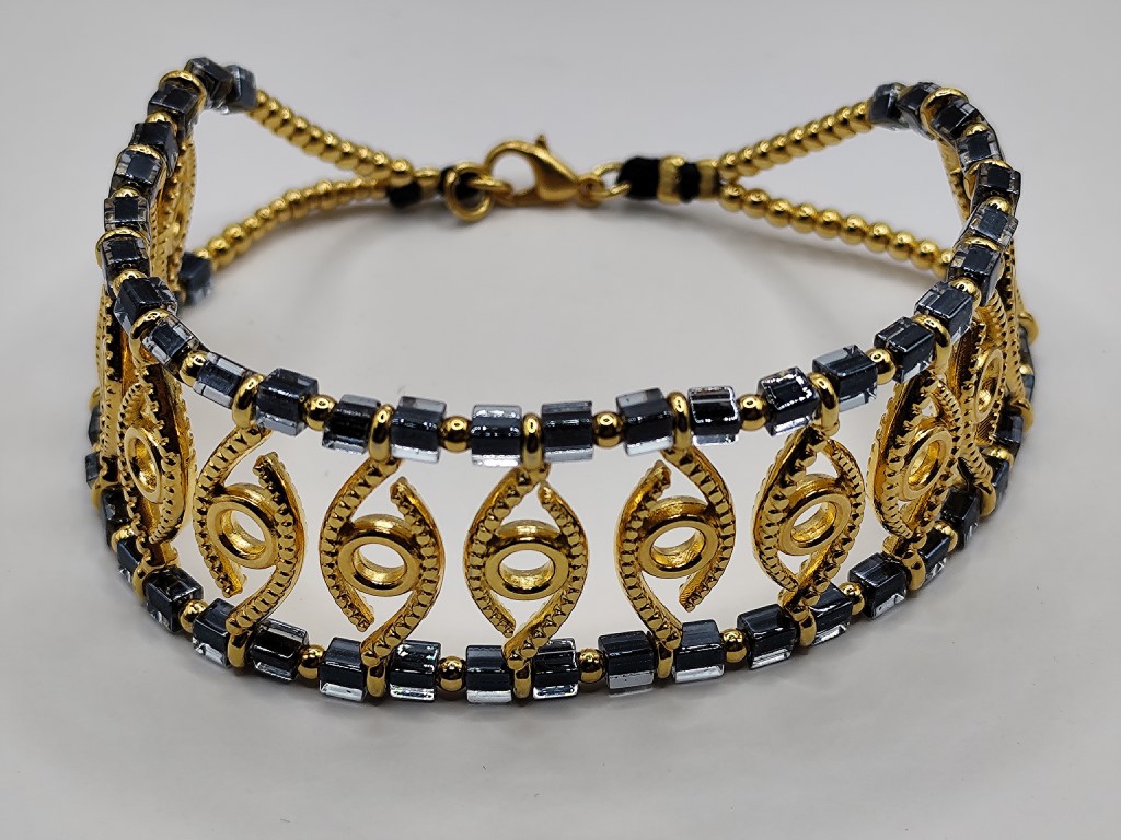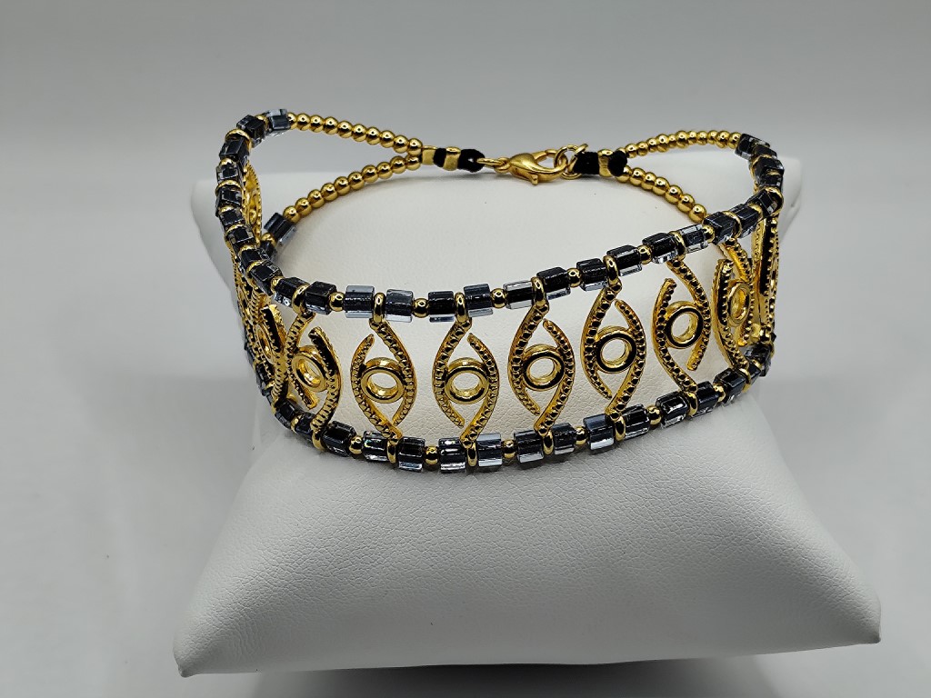 Χειροποίητο βραχιόλι φαρδυ κομψό φτιαγμένο με επιχρυσωμένα στοιχεία 18 – 24κ με την δική τους λεπτομέρεια επάνω και κρύσταλλους