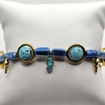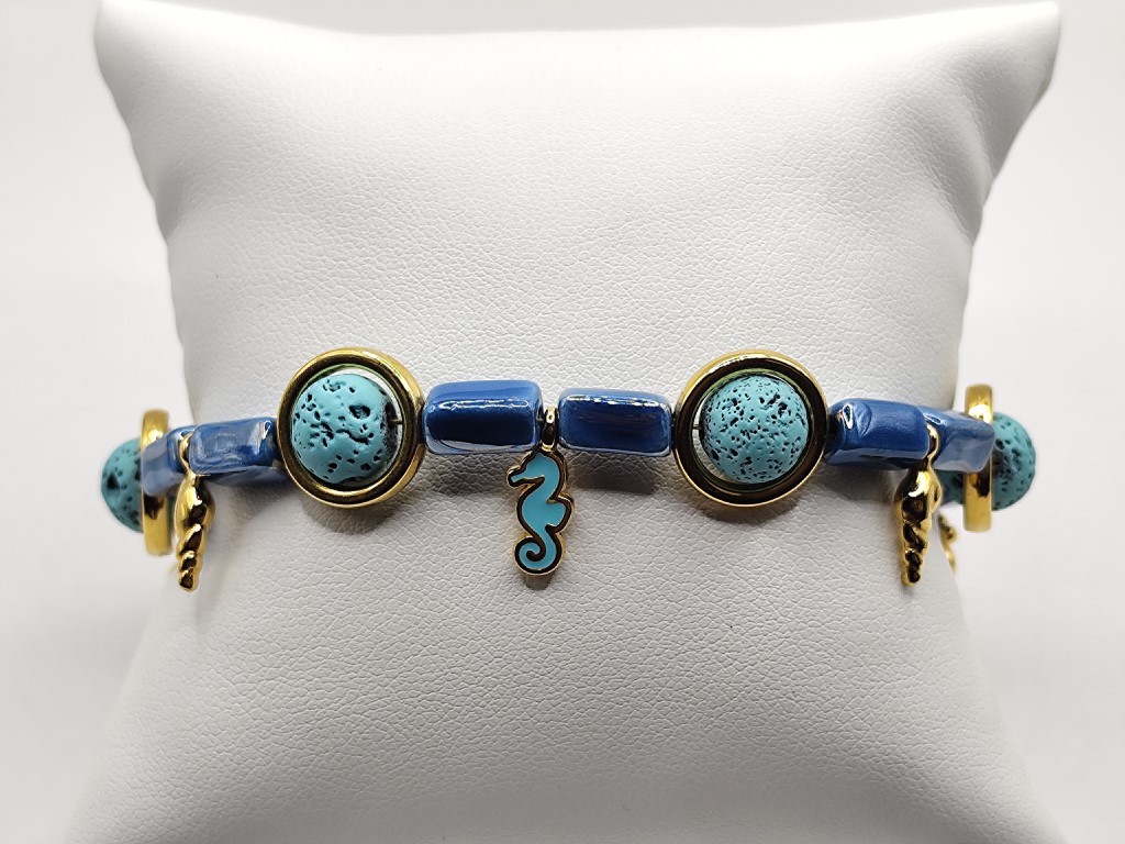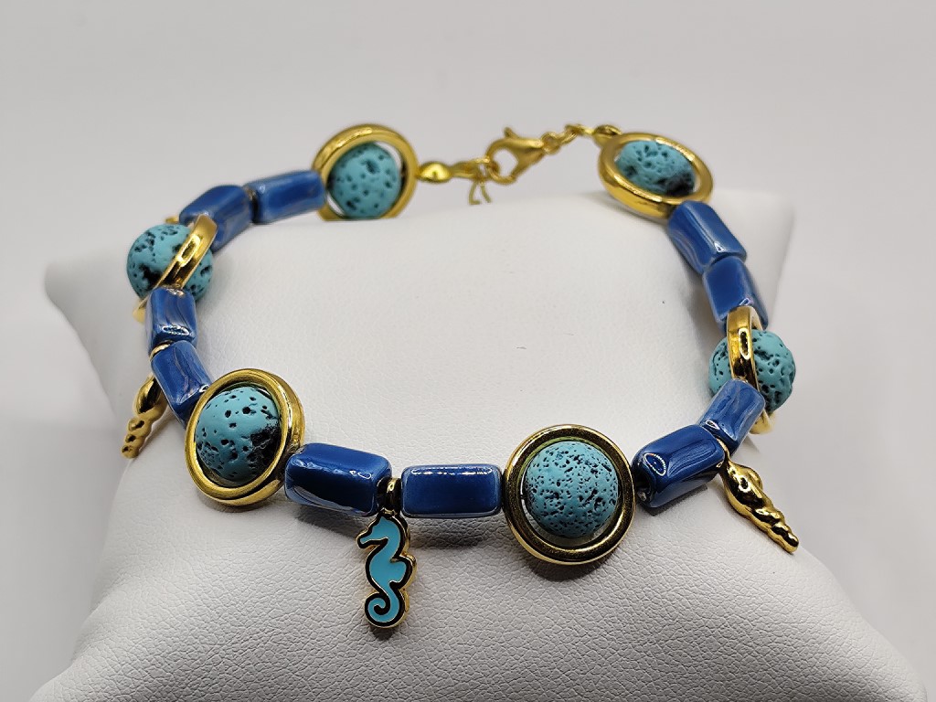 Χειροποίητο βραχιόλι φτιαγμένο με κεραμικα κομματια επισμαλτωμένα , λάβα μέσα σε κρίκους και διαφορα επιχρυσωμένα μικρα στοιχεία με σμάλτο