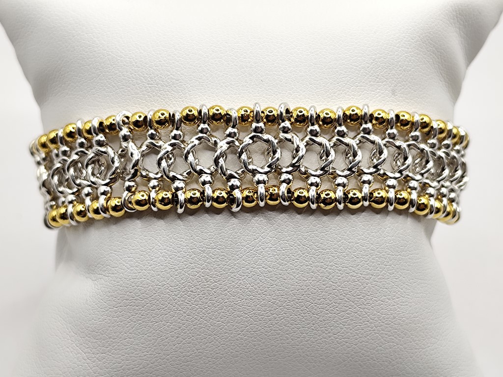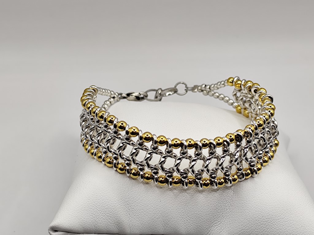 Χειροποίητο βραχιόλι, φτιαγμένο με προσοχή στην λεπτομέρεια, με πλέξη μεταλλικών στοιχείων από ανοξείδωτο ατσάλι και επιχρυσωμένα στοιχεία 18-24k.