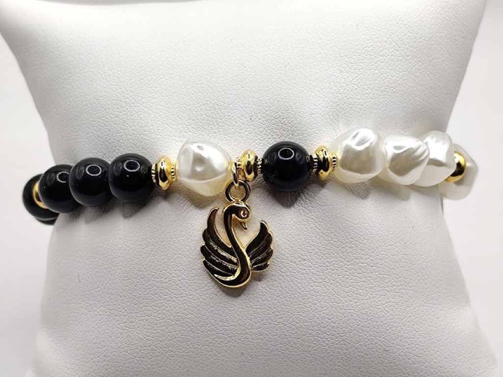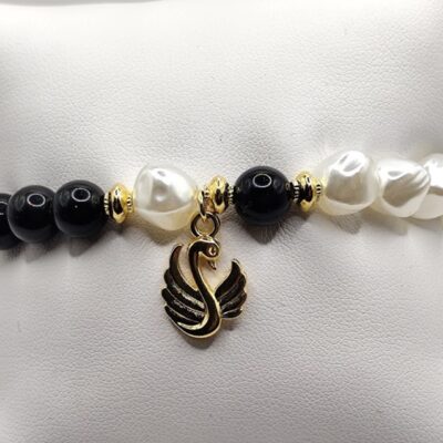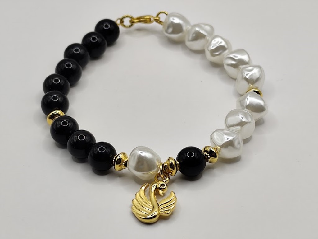 Χειροποίητο βραχιόλι, φτιαγμένο με μεράκι, το μισό με μαύρες χάντρες και το άλλο μισό με ασύμμετρες πέρλες. Στοιχείο κύκνος επιχρυσωμένος με 18-24k.