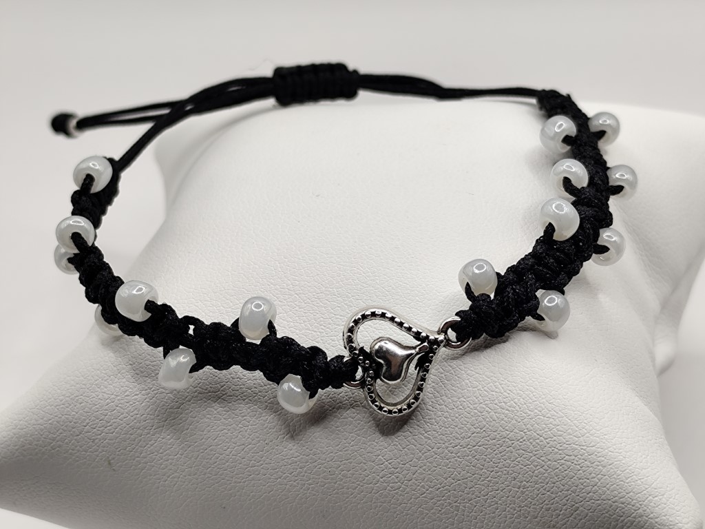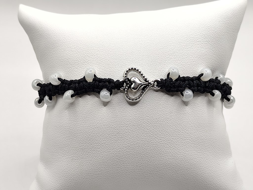 Χειροποίητο βραχιόλι, με άσπρες χάντρες, πλεγμένες στο μακραμέ με μαύρο κορδόνι και κεντρικό στοιχείο ατσάλινη καρδιά.