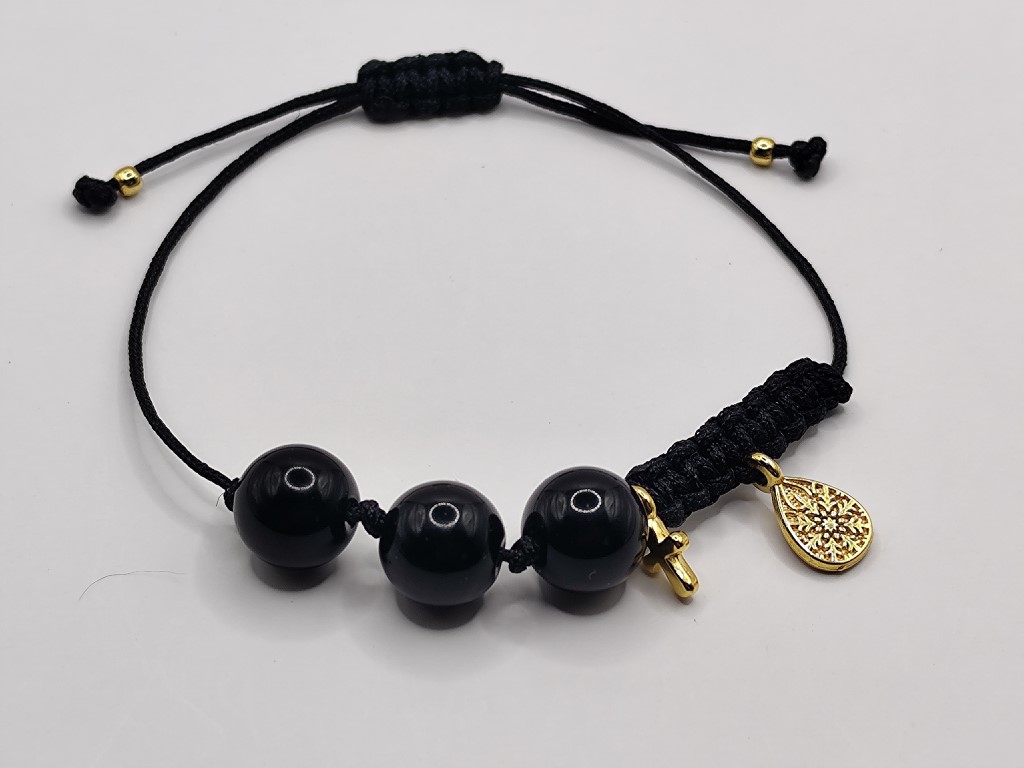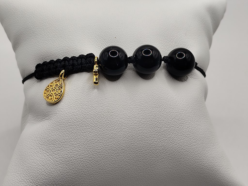Χειροποίητο βραχιόλι με πλέξη μακραμέ, μαύρες χάντρες και επιχρυσωμένα στοιχεία 18-24k δάκρυ και σταυρουδάκι.