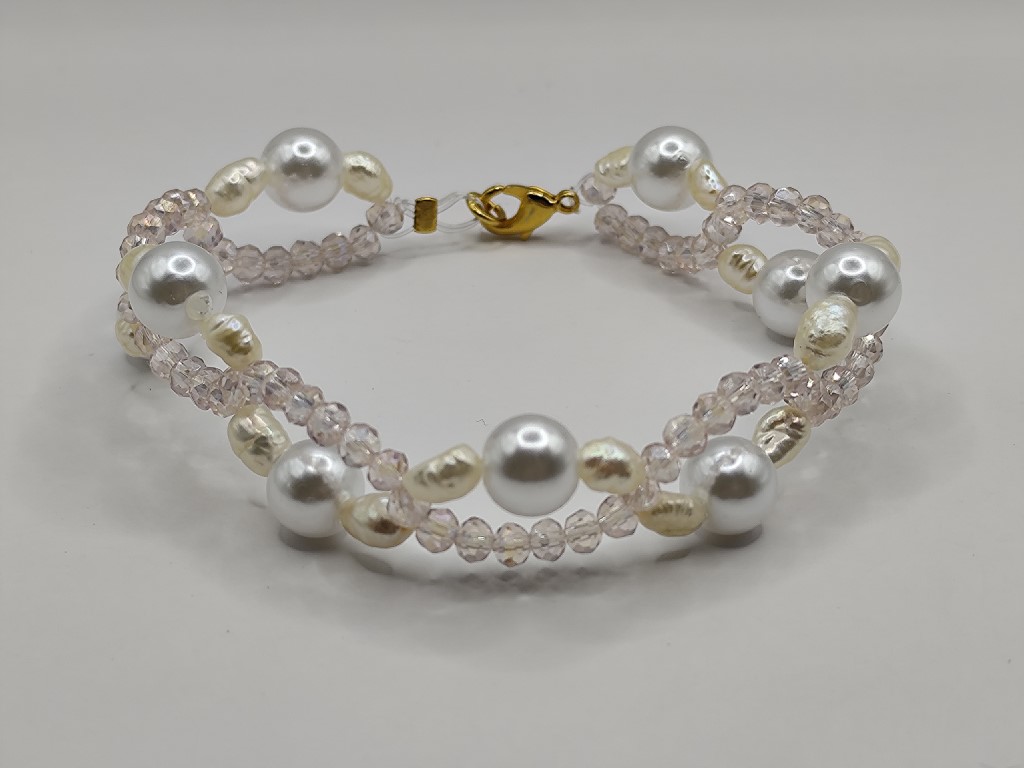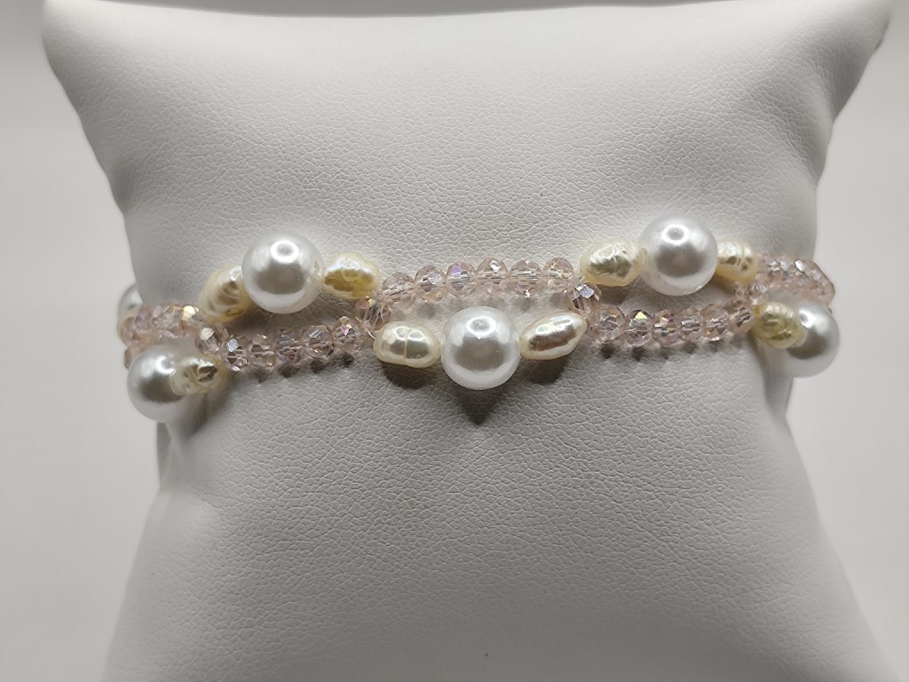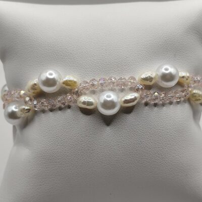 Χειροποίητο βραχιόλι, δημιουργημένο με μεράκι, με κρυστάλλους, μαργαριτάρια του γλυκού νερού και πέρλες. Συνδυασμένα μεταξύ τους σε μια ιδιαίτερη πλέξη.